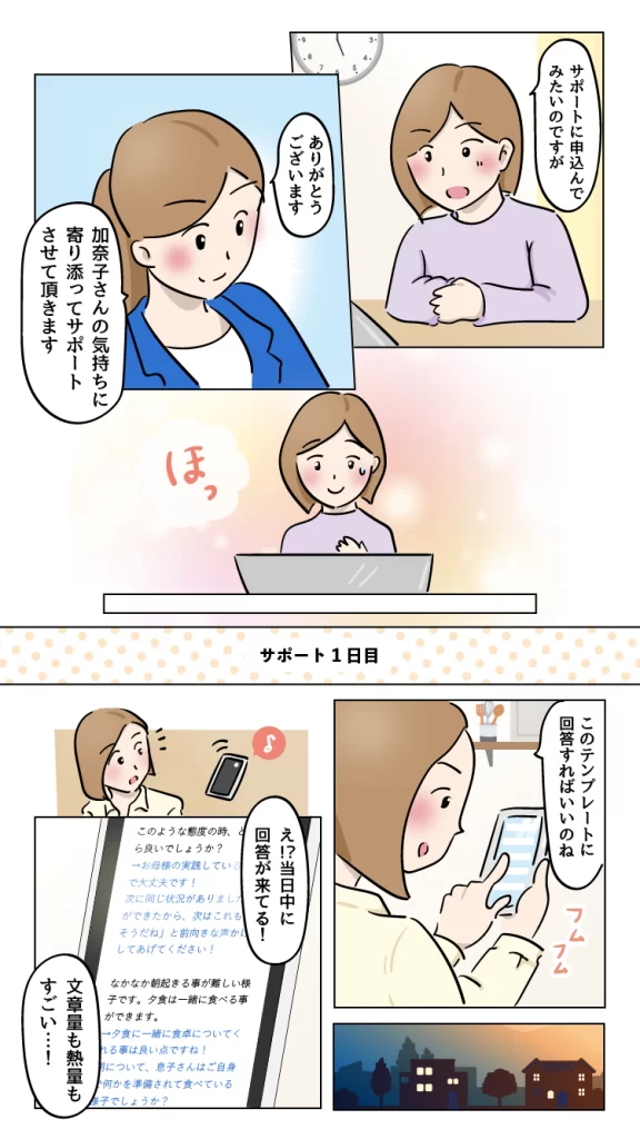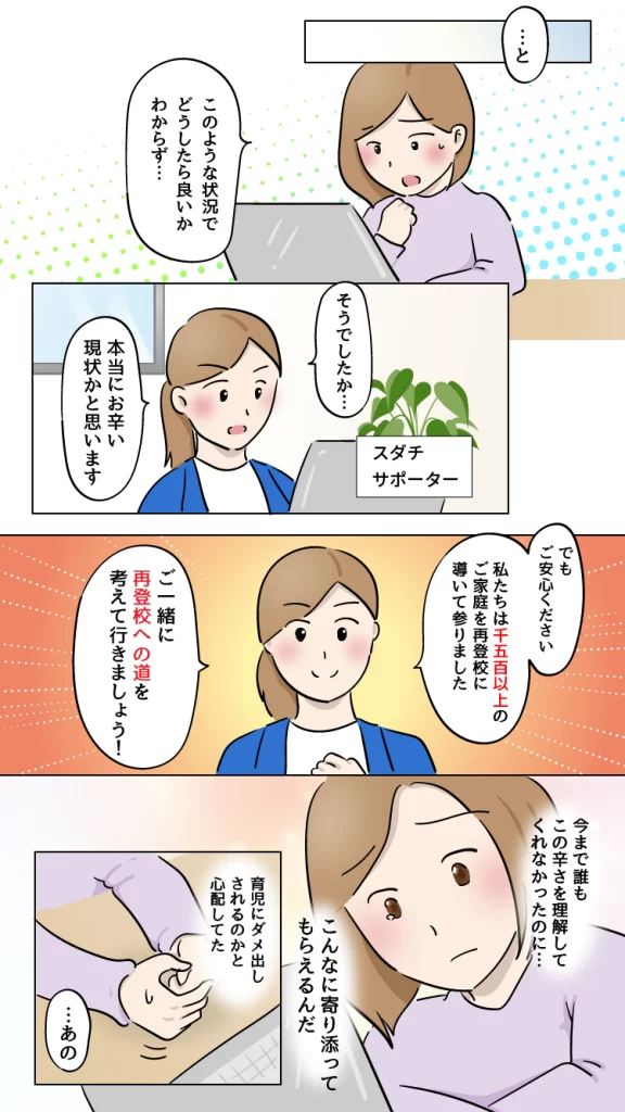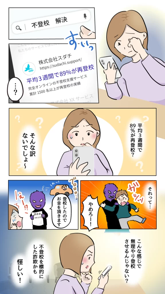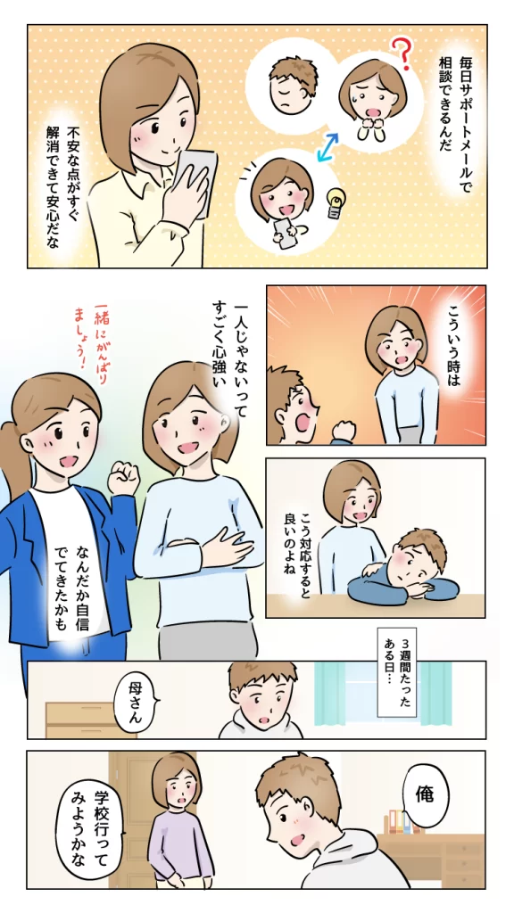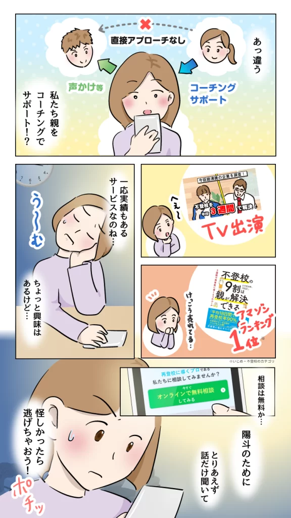 漫画LP『不登校の息子が3週間後に再登校するまで』 不登校に悩む親御さんに向けて、その不安や焦燥感に寄り添いつつ、サービスを受けた後の自信を思い描いていただけるよう設計しております。 仕様/JPEG 全10ページ(表紙含む) 使用ツール/Illustrator 担当範囲/ラフ制作、ページ構成、デザイン・イラスト作成 ※秘密保持の観点から、一部文章を変更しております。 戻る
